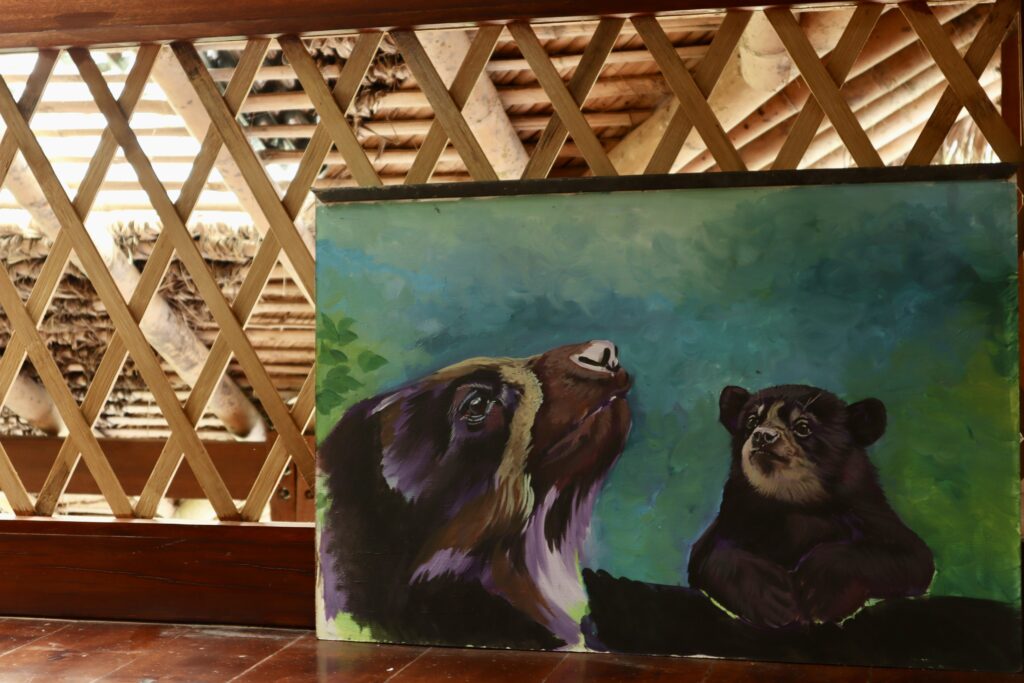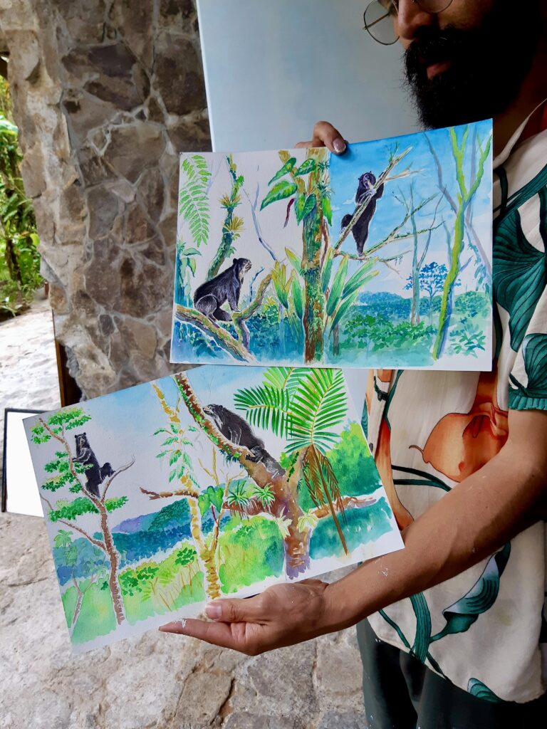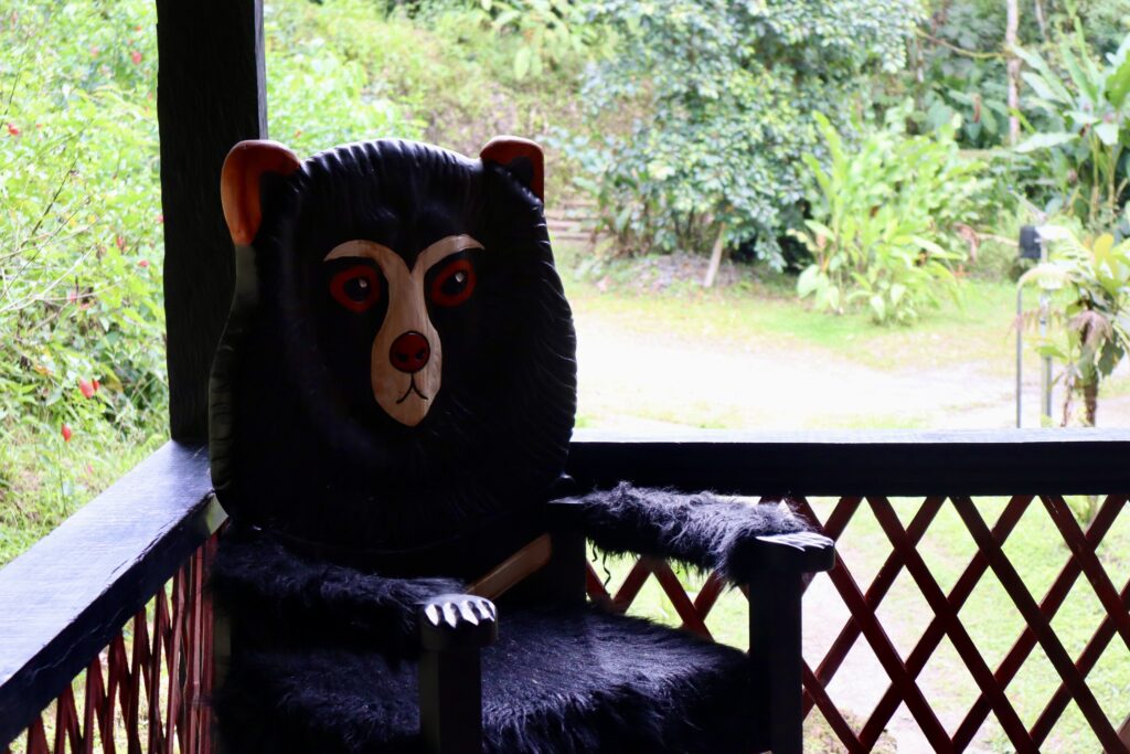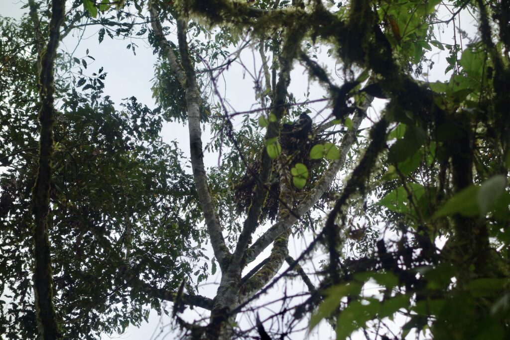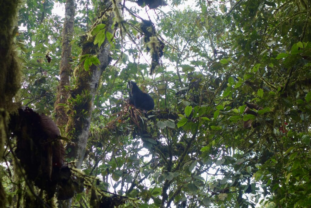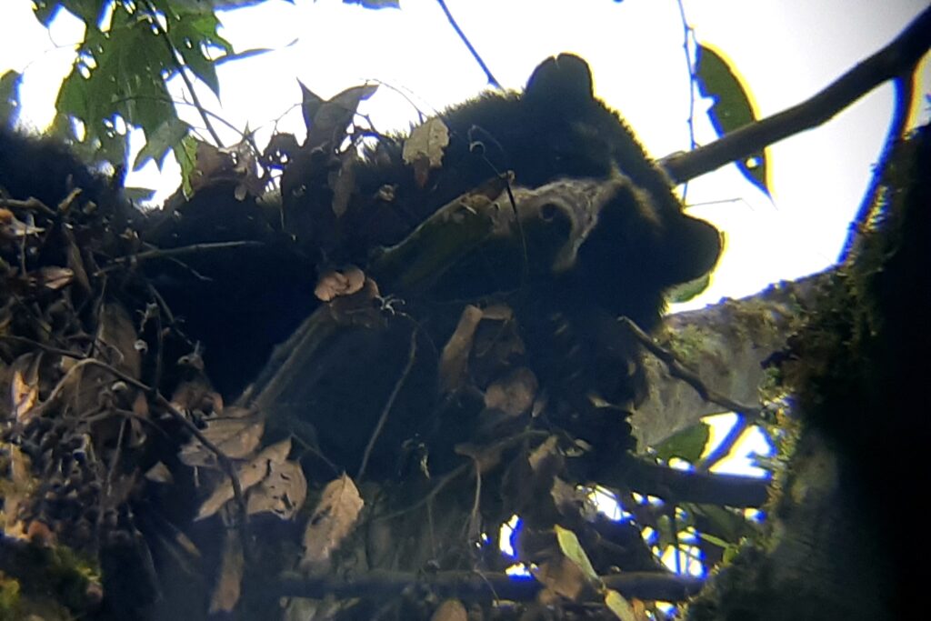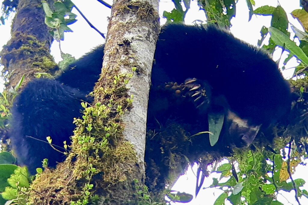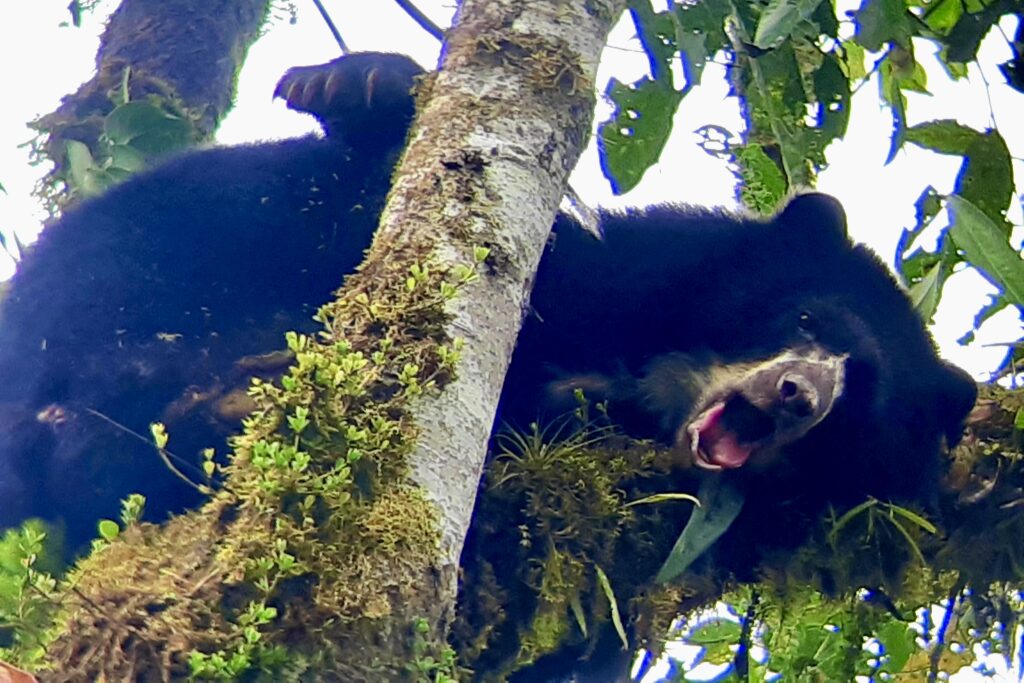Aber ja, ich habe tatsächlich Glück und sehe jeweils einen weiblichen Brillenbären an den beiden Vormittagen. Der erste Bär am ersten Tag guckt ab und zu neugierig zu uns, schläft aber vor allem in seinem Nest (ja, diese Brillenbären bauen Nester in den Bäumen).