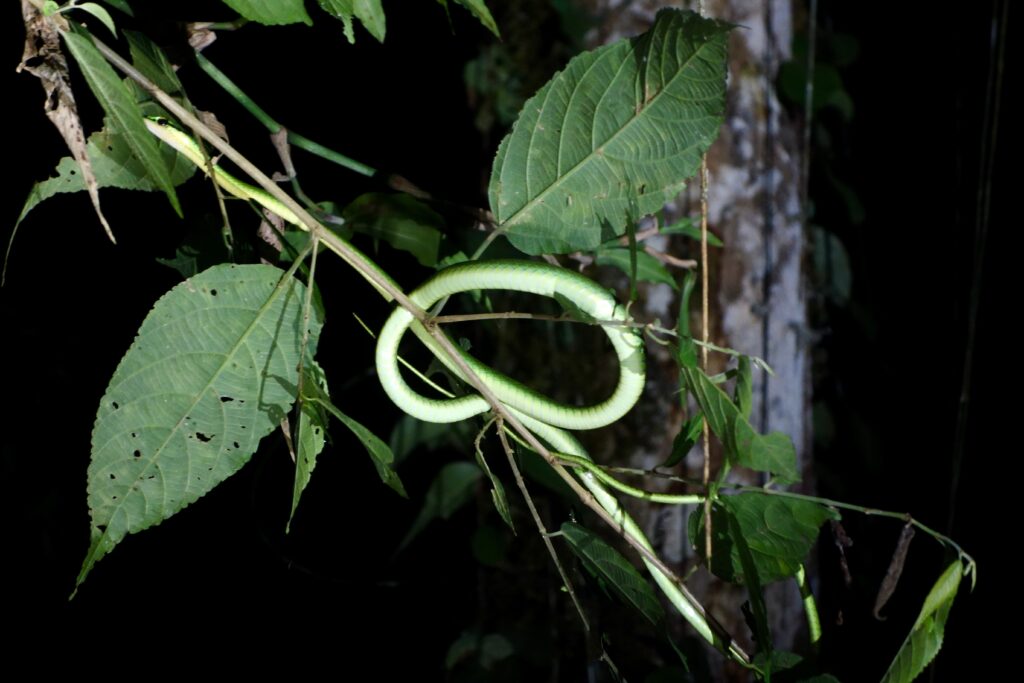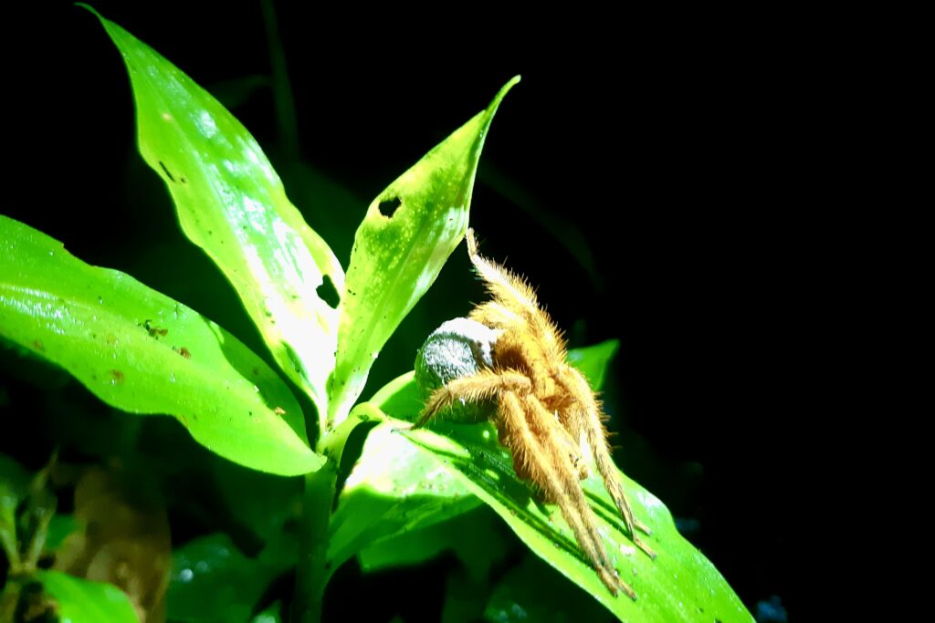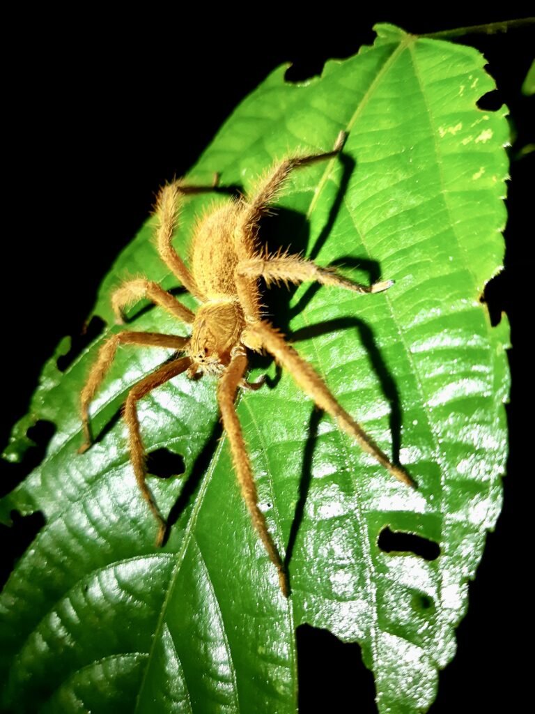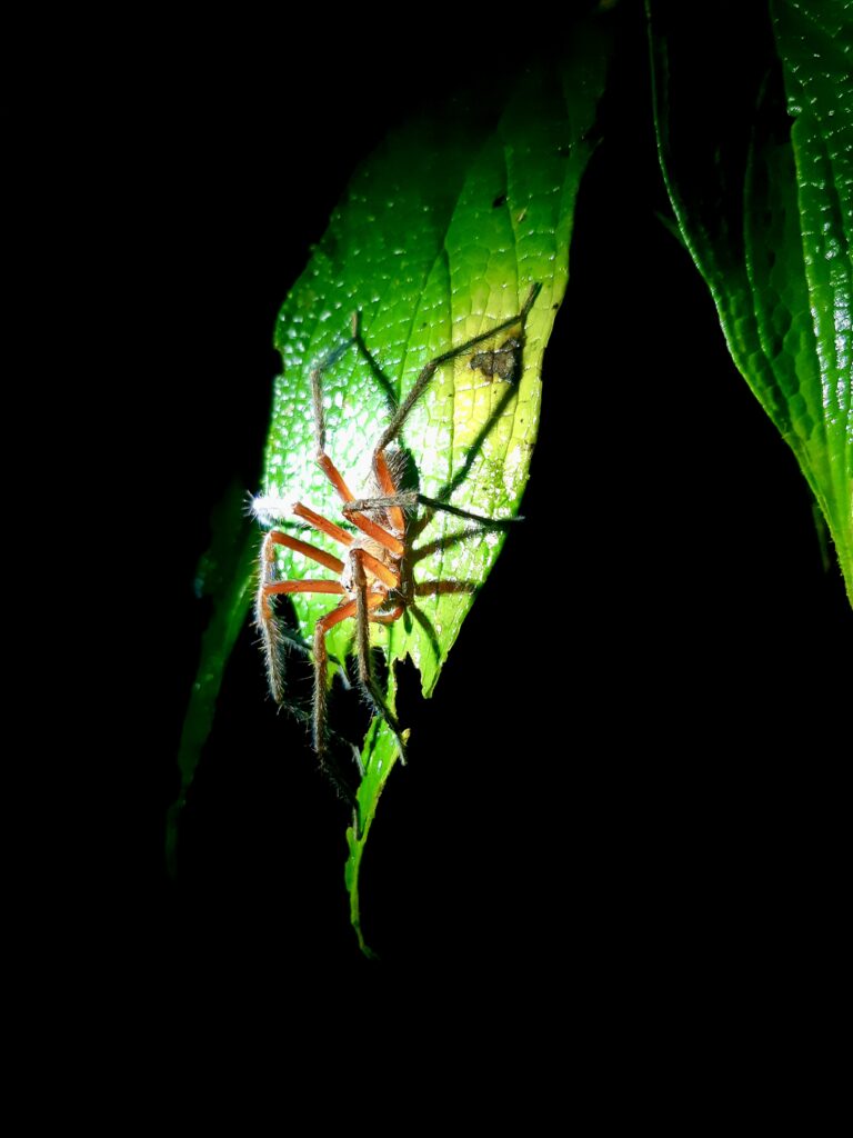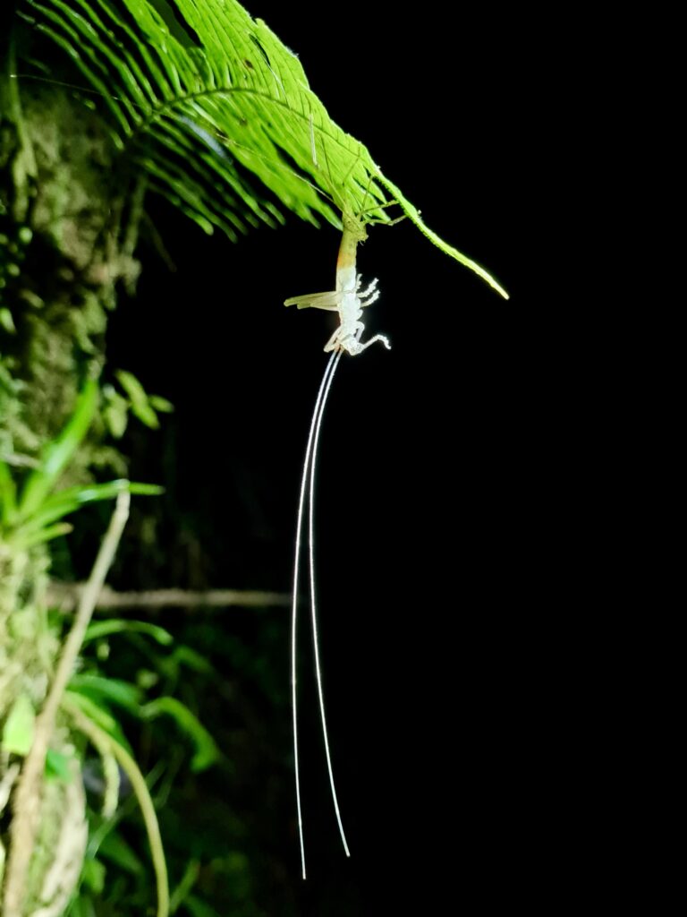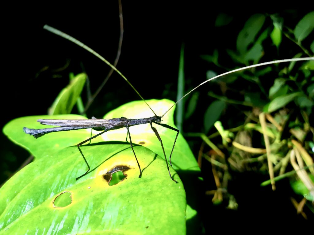 Nach dem Abendessen wird eine Nachtwanderung angeboten. Genauso wie bei einer weiteren Nachtwanderung am nächsten Abend sind wir nur wenige Leute, das eine Mal sogar nur zu zweit plus Guide. Mit so wenigen Leuten touren zu machen, ist sehr schön. Wir sehen viele Stabheuschrecken, Spinnen, Käfer, Frösche und sogar eine Schlange und überall sind Glühwürmchen, die immer wieder aufleuchten, einfach magisch!