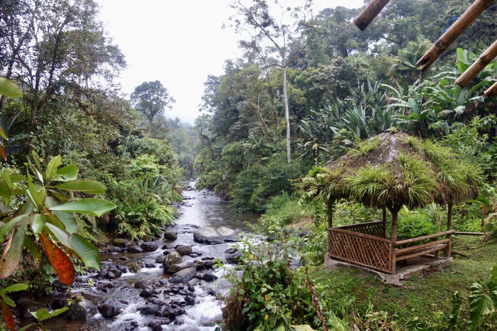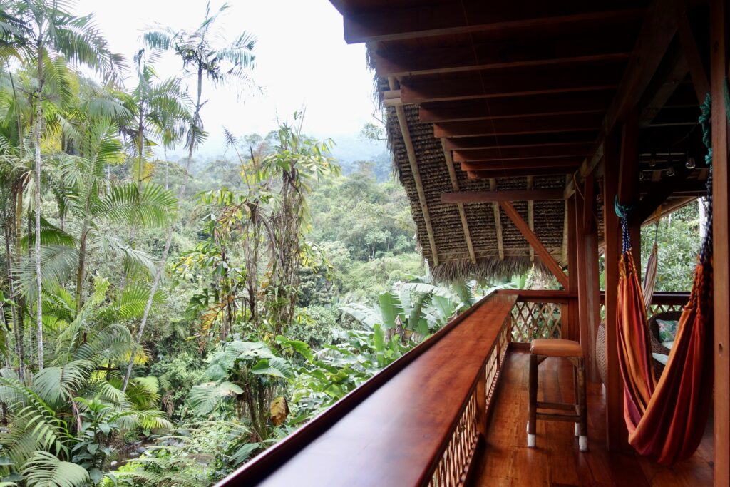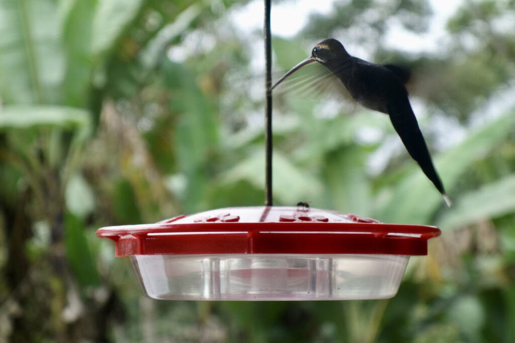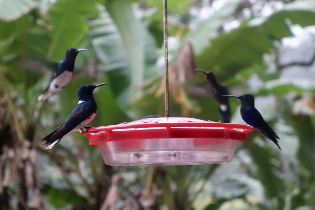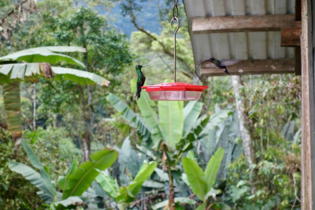 Die Maquipucuna Lodge, in der ich übernachte, liegt mitten im Wald, an einem Fluss gelegen. Den Eingang der Lodge bildet eine Brücke über den Fluss. Sofort verliebe ich mich in diesem Ort. Bereits auf dem Weg zum Mittagessen sehe ich ganz viele Schmetterlinge und beim Mittagessen bin ich beeindruckt, wie viele Kolibris durch die kleinen hängenden Futterhäuschen mit Zuckerwasser angelockt werden. Während des sehr leckeren Essens fliegen sie um einen herum, es ist einfach traumhaft. Jeder Kolibri sieht anders aus, es gibt so viele Arten. Neben den Kolibris sehe ich kurz auch einen Tucan in der Ferne.