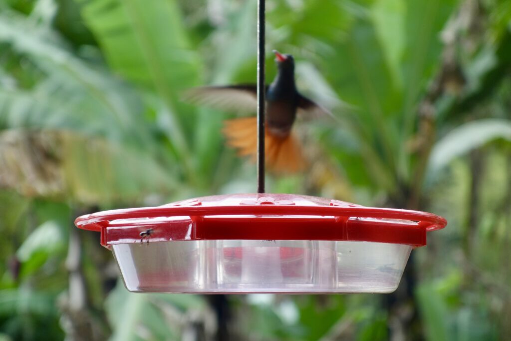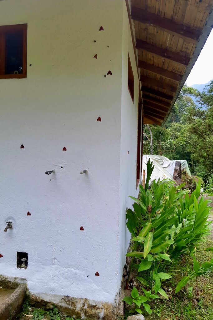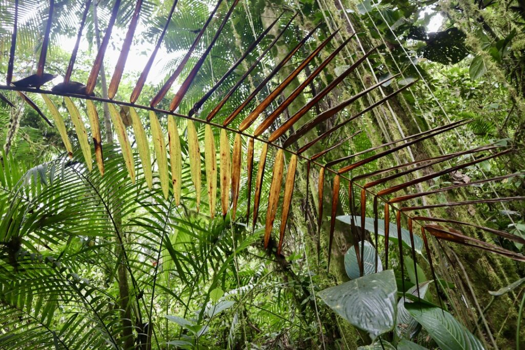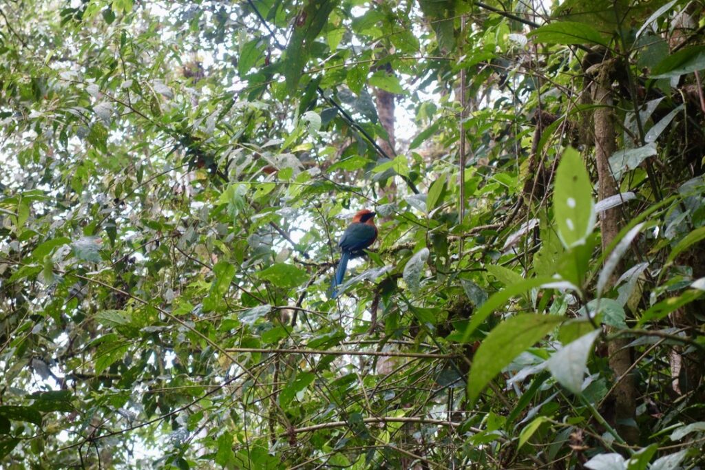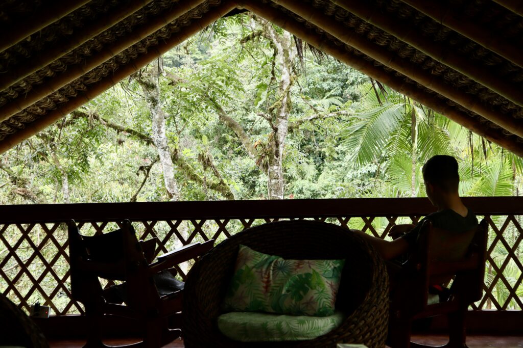Die Maquipucuna Lodge, in der ich übernachte, liegt mitten im Wald, an einem Fluss gelegen. Den Eingang der Lodge bildet eine Brücke über den Fluss. Sofort verliebe ich mich in diesem Ort. Bereits auf dem Weg zum Mittagessen sehe ich ganz viele Schmetterlinge und beim Mittagessen bin ich beeindruckt, wie viele Kolibris durch die kleinen hängenden Futterhäuschen mit Zuckerwasser angelockt werden. Während des sehr leckeren Essens fliegen sie um einen herum, es ist einfach traumhaft. Jeder Kolibri sieht anders aus, es gibt so viele Arten. Neben den Kolibris sehe ich kurz auch einen Tucan in der Ferne.
