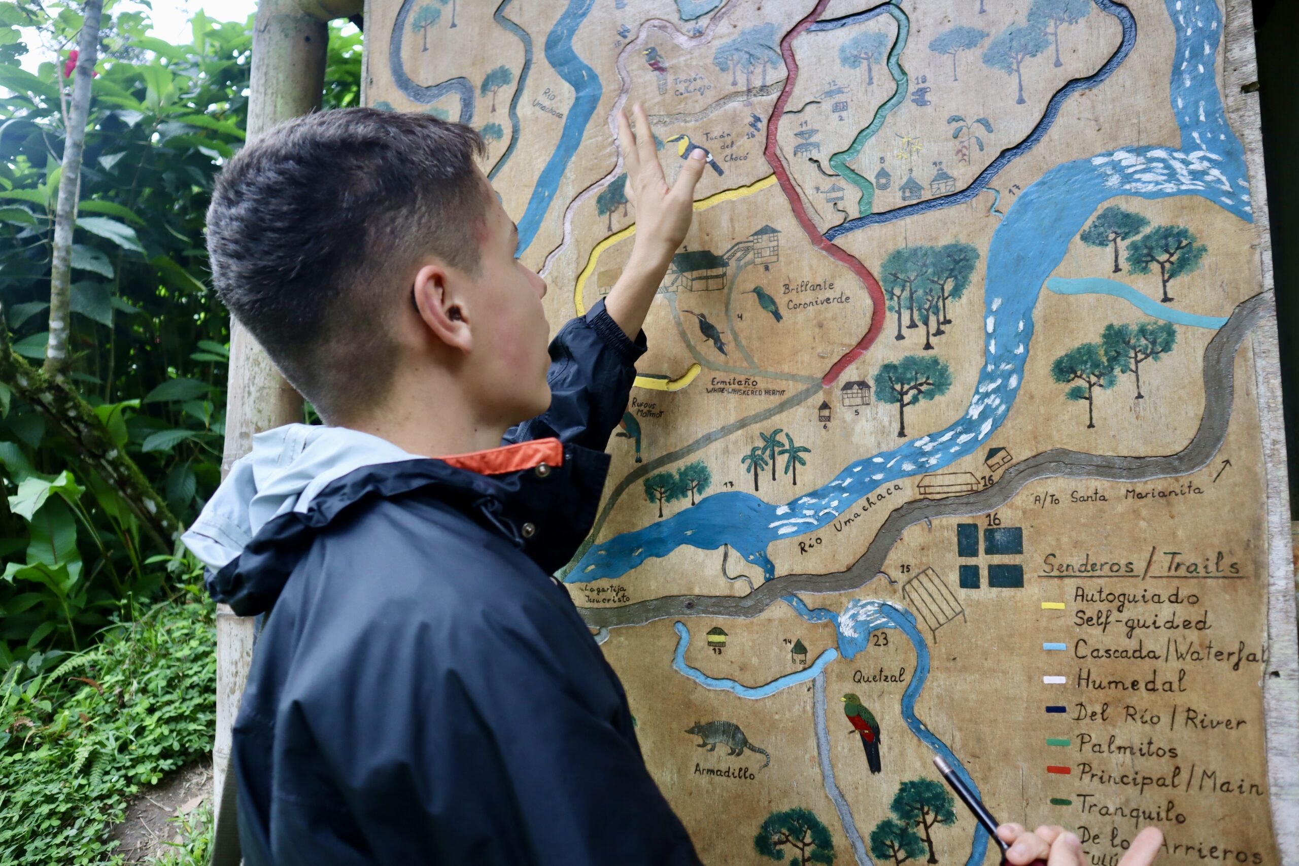 Die Maquipucuna Lodge, in der ich übernachte, liegt mitten im Wald, an einem Fluss gelegen. Den Eingang der Lodge bildet eine Brücke über den Fluss. Sofort verliebe ich mich in diesem Ort. Bereits auf dem Weg zum Mittagessen sehe ich ganz viele Schmetterlinge und beim Mittagessen bin ich beeindruckt, wie viele Kolibris durch die kleinen hängenden Futterhäuschen mit Zuckerwasser angelockt werden. Während des sehr leckeren Essens fliegen sie um einen herum, es ist einfach traumhaft. Jeder Kolibri sieht anders aus, es gibt so viele Arten. Neben den Kolibris sehe ich kurz auch einen Tucan in der Ferne.