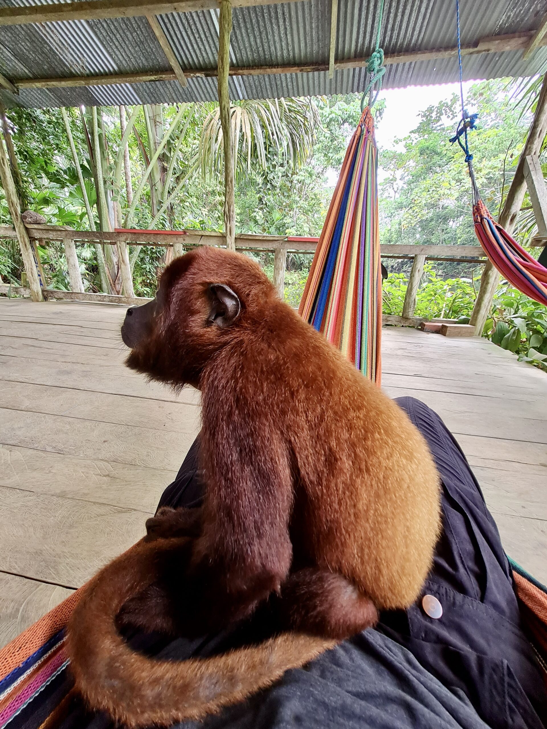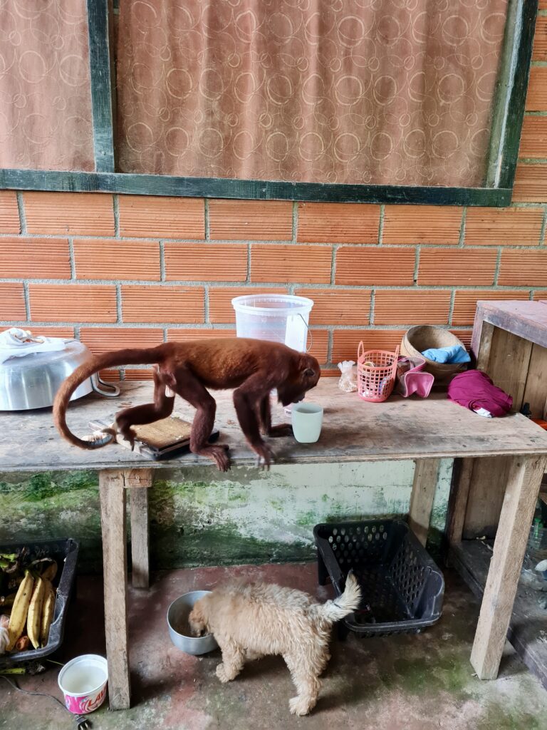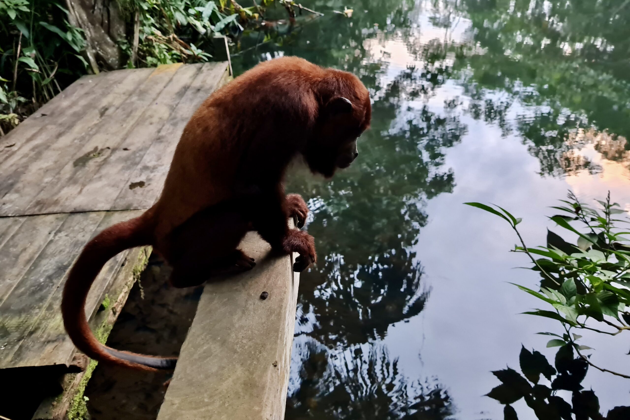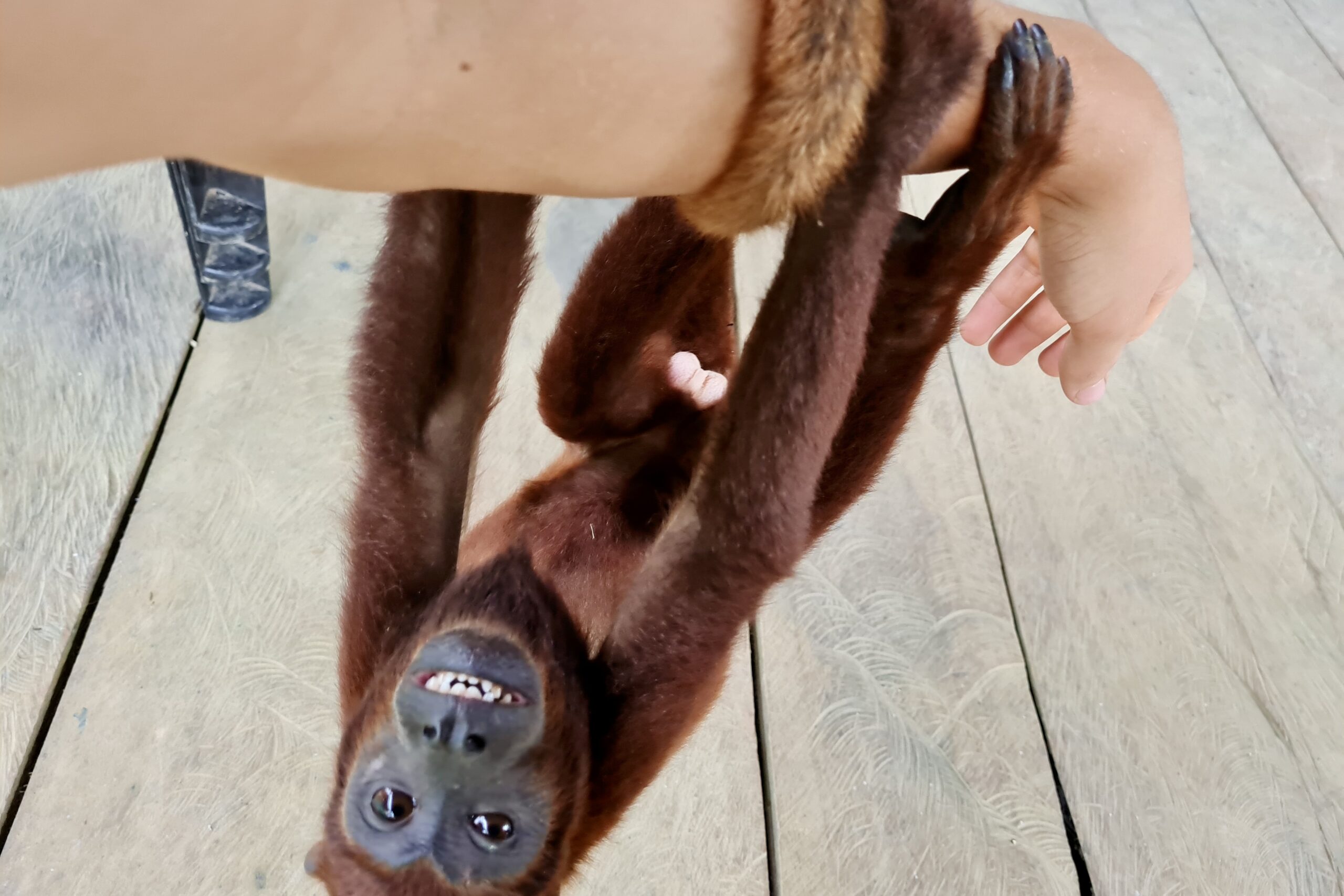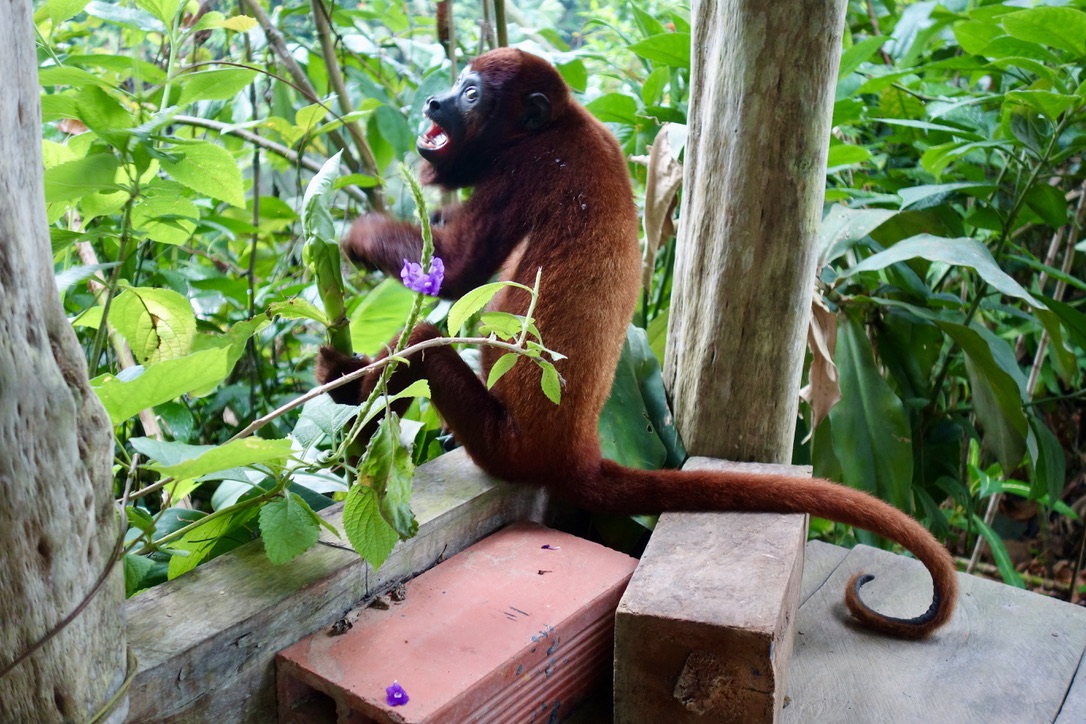 In der Unterkunft lebt auch ein junges rotes Brüllöffchen, dass wohl von seiner Familie ausgestoßen wurde. Mehrmals haben die Besitzer der Unterkunft das Äffchen versucht wieder in den Wald auszusetzen, aber es ist immer wieder zurückgekommen.
